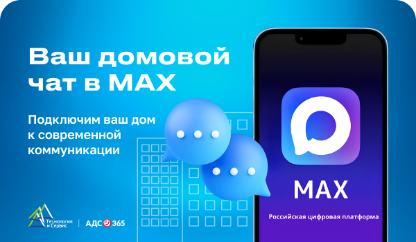 | +7 (3812) 37-85-95 | | info@ads365.ru | | | | Уважаемые председатели и члены правления ТСЖ и ТСН | | | | Единая диспетчерская служба города Новосибирска «АДС365» обращается к вам с инициативой, направленной на повышение качества коммуникации между управляющими организациями и жителями многоквартирных домов. | | | | В рамках развития цифровых сервисов и повышения удобства взаимодействия собственников мы предлагаем помощь в создании и организации домовых чатов в российском национальном мессенджере MAX. | | | Использование MAX позволяет:- обеспечить защищённую и стабильную связь между жителями и ТСЖ;