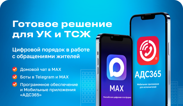 Наш ИТ-продукт разработан с учётом требований: ПП РФ № 331 от 27.03.2018, ПП РФ № 354, № 416, № 1090, Постановления Госстроя РФ № 170 и ГОСТ 56037-2014. | | | | Что мы сделаем для вашего ТСЖ / УК | | | | | Создадим общедомовую группу/чат в MAX (по дому/подъездам — по вашему решению), настроим структуру, описание и правила общения. | | | | Добавим в чат бота для приёма обращений жителей в «единую диспетчерскую» (отопление, вода, электрика, лифты, аварии и др.). | | | | Настроим маршрутизацию: каждое обращение фиксируется как заявка и направляется ответственным исполнителям. | | | | Обеспечим уведомления исполнителям о новых заявках и статусах: в MAX и/или Telegram и/или в нашем мобильном приложении (на выбор). | | | | Подготовим краткий регламент и инструкции (для жителей, правления и исполнителей) + проведём вводный инструктаж. | | | | | | Для новых клиентов предоставляем 2 (два) месяца пользования системой «АДС365» бесплатно; | | | | Программное обеспечение, мобильные приложения, а также боты в Telegram и MAX — предоставляются бесплатно. | | | | По итогам сформируем короткий отчёт: количество обращений, скорость реакции, закрытие заявок, типовые проблемы и рекомендации. | | | | | | Контактное лицо от организации (ФИО, телефон) для согласования структуры чата и списка исполнителей. | | | | Перечень исполнителей/ответственных (ФИО, должность, телефон), кому направлять уведомления по заявкам. | | | | Согласование правил чата и текста приветственного сообщения для жителей. | | | | При необходимости — список домов/подъездов и удобный формат группирования (один чат на дом или на несколько). | | | | | Что это даст Вам и жителям | | | | | Единая точка входа для обращений жителей — меньше хаоса в личных чатах и звонках. | | | | Прозрачность: каждое обращение превращается в заявку со статусом и ответственным. | | | | Контроль исполнения: уведомления и фиксация действий исполнителей. | | | | Снижение конфликтов и жалоб за счёт понятного процесса обработки обращений. | | | | | Мы будем рады содействовать вам в повышении цифровой культуры и улучшении качества взаимодействия с жителями. | | | Для получения подробной информации или запуска процесса организации чата вы можете связаться с нами по удобному для вас каналу: | | | |