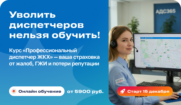 | Уважаемые руководители УК и ТСЖ! | | | | По Постановлению Правительства РФ №331 АДС обязана реагировать на заявки жителей за 5-10 минут. ГЖИ следит за нарушениями в этой области, а судебная практика показывает, что органы правосудия все чаще признают вину УО и ТСЖ за недостаточную организацию АДС. | | | | Одна ошибка диспетчера АДС запускает цепную реакцию: | | | | Недовольство ➡︎ Жалобы в ГЖИ ➡︎ Потеря репутации ➡︎ Потеря домов | | | | | | | создан, чтобы повысить квалификацию Ваших сотрудников, внедрить лучшие практики отрасли, навести порядок в работе АДС раз и навсегда! | | | | | | | Программа курса включает 5 мощных модулей: | | | | | Право без ошибок: Знание законов, для защиты от жалоб и штрафов | | | | Технический ликбез: Как понимать проблему по словам жильца и ставить точный "диагноз" | | | | Оперативное управление в режиме «ЧП»: Контроль нескольких исполнителей без паники и потерь | | | | Искусство диалога под давлением: Как успокоить «горячего» клиента и сохранить репутацию УК | | | | Цифровизация АДС: Прозрачность всех процессов, автоматизация рутины | | | | | 10 лет практики 5 млн обслуживаемых квартир 4500+ УК-партнеров