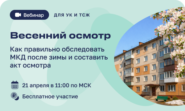 Мероприятие будет полезно для специалистов, ответственных за работу МКД в сфере ЖКХ, позволит систематизировать знания, избежать типичных ошибок и быть готовыми к новым требованиям законодательства. | | | | | ЛЕКТОР Медведева Елена Викторовна | | Практикующий юрист в крупной Российской компании, преподаватель кафедры юридических дисциплин в Омском государственном университете им. Ф. М. Достоевского. Более 6 лет опыта работы в "ЕРЦ" и 7 лет работы в РСО. | | | | | | БЛОК 1: ЗАКОНОДАТЕЛЬНЫЕ ТРЕБОВАНИЯ И ОТВЕТСТВЕННОСТЬ | | 1. Нормативные акты, в которых закреплена обязанность проводить сезонные осмотры и ответственность за нарушения; 2. Сроки проведения по законодательству РФ (в зависимости от региона); 3. Обязательные участники осмотра, есть ли штрафные санкции за игнорирование требований по осмотру МКД; 4. Разбор судебных практик. | | | | БЛОК 2: ПРАКТИЧЕСКОЕ РУКОВОДСТВО ПО ОСМОТРУ | | 1. Подготовка к осмотру: с чего следует начать; 2. Маршрутная карта: По какому пути двигаться, чтобы ничего не пропустить?; 3. Типичные проблемы весеннего осмотра 4. Взаимодействие с жителями: Как поступить, если в ходе осмотра жители отказываются пускать в квартиру для проверки стояков или вентиляционных каналов? Как это зафиксировать? | | | | БЛОК 3: КАК СОСТАВИТЬ АКТ ОСМОТРА | | 1. Разбор акта осмотра: правильное составление документа, что обязательно должно быть в шаблоне, разделение дефектов на категории, важность фотофиксации | | | | | Дополнительные возможности для участников: | | | | | Шаблон акта осмотра с примерами формулировок Чек-лист «50 точек осмотра МКД весной» | | | | | | -50% на годовую подписку на все платные вебинары -30% на персональную консультацию по ГИС ЖКХ | | | | | *Чтобы применить скидку - сообщите об этом менеджеру. Акция действительна 1 месяц после проведения вебинара. | | | | Мы хотим, чтобы наши вебинары были максимально полезными для вас! | | | | Напишите, какие темы вас интересуют или в каком вопросе вы бы хотели разобраться, и мы учтем ваши пожелания при планировании следующих мероприятий. | | | |