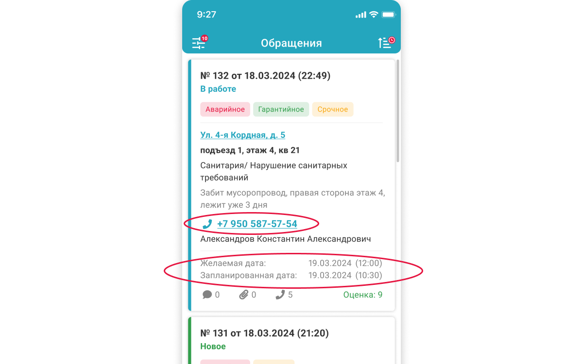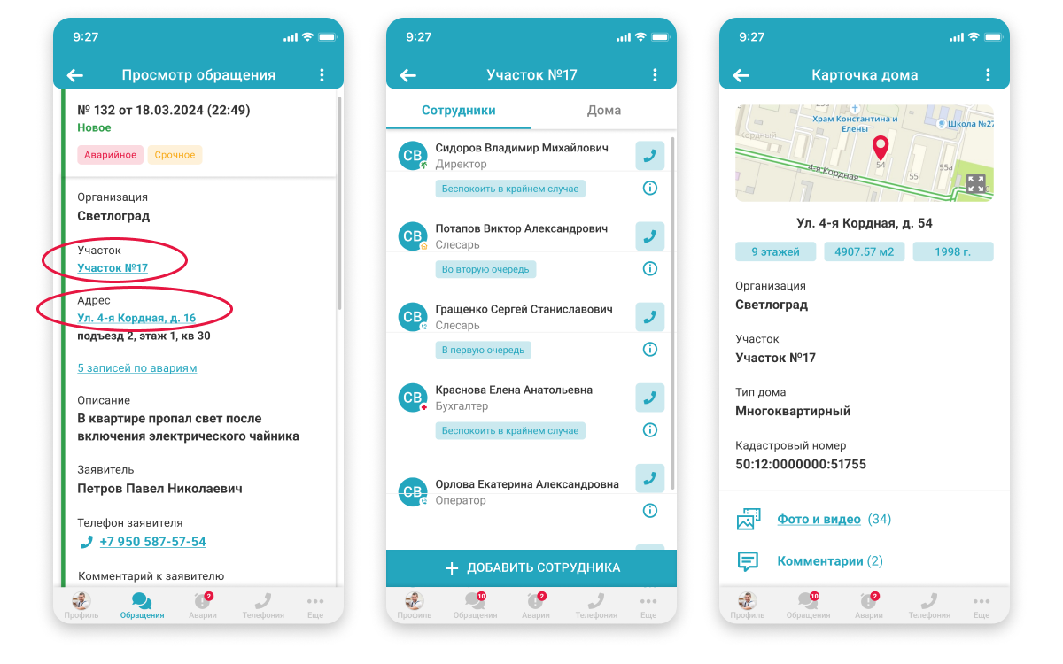 Добавили отображение Желаемой и Запланированной даты исполнения в краткой карточке обращения. | | | | Добавили информацию об участке в карточку обращения. При клике на участок - переход на карточку участка с отображением всех сотрудников участка и их контактов - фио, должность, номера телефонов.