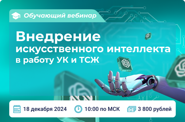 | Облегчите и ускорьте работу, благодаря новым технологиям! | | | | На вебинаре наглядно продемонстрируем возможности нейросети, в частности ChatGPT, и поделимся методами внедрения современных технологий в сферу ЖКХ для повышения эффективности сотрудников. | | | | Вебинар предназначен для: | | | | | Руководителей управляющих компаний, РСО, ТСЖ, ЖСК | | | | Сотрудников, которые работают с документами и занимаются коммуникацией с жильцами дома | | | | Специалистов в области жилищного права и законодательства | | | | | | Спикер вебинара | | Медведев Владимир Михайлович Коммерческий директор компании ООО «Технология и сервис» | | | | | | Почему ИИ становится важной частью управления в ЖКХ; | | | | Основы ChatGPT и принципы его работы; | | | | Ведение соцсетей с помощью ИИ; | | | | Экономия времени сотрудников УК и ТСЖ с помощью чат-ботов; | | | | Конкурентные преимущества от внедрения инновационных решений; | | | | | Подпишитесь на наши социальные сети и получите скидку 5% на вебинар | | | | Для всех участников вебинара: | | | | 18 декабря в 10:00 по Москве Вы сможете присоединиться к вебинару в прямом эфире. (на почту направим ссылку на подключение) | | | | Не пропустите другие вебинары! | | | | | 28 ноября | | На вебинаре получите полное руководство по организации собственной АДС и найдете ответы на самые частые вопросы, чтобы избежать штрафов и обеспечить надежное обслуживание жителей! | | | | | | 4 декабря | | На вебинаре узнаете о новых требованиях законодательства. Повысите квалификацию в вопросах управления данными и защитите персональные данные собственников от утечек и взломов. | | | | | | 5 декабря | | Узнайте, как использовать социальные сети для повышения лояльности среди жильцов, с помощью эффективных инструментов и стратегий! | | | | | | 19 декабря | | Получите разъяснения по последним изменениям в регулировании сферы ЖКХ и практические рекомендации по решению сложных и спорных вопросов отрасли! | | | | | | 25 декабря | | Освоите ключевые моменты расчетов за коммунальные ресурсы в нежилых помещениях и паркингах, разберетесь в законодательных нюансах и получите советы по ведению расчетов и управлению договорами с РСО. | | | | | | | | Юридическая поддержка | | Консультации по вопросам деятельности организации. Юридическая экспертиза договоров и соглашений. Разовые услуги и полное сопровождение. | | | | | Мы работаем во всех регионах России! | | | | | Главный офис находится в Омске | | Ул. Фрунзе 1, корп. 4, 6 этаж, офис 607 г 8-800-550-39-96