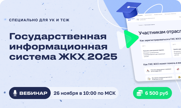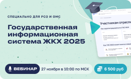 | | | | | | Видеозапись вебинара | | В течение недели отправим участникам запись вебинара. | | | | Презентация спикера | | Отправим презентацию спикера в формате pptx. | | | | Закрывающие документы для бухгалтерии | | Мы указали конечную стоимость вебинара, для организаций нет никаких дополнительных платежей. Предоставим акт выполненных работ. | | | | Персональный сертификат участника | | После завершения вебинара Вы получаете именной сертификат участника, подтверждающий знания по теме. | | | | Доступ в закрытый чат компании в Whatsapp | | Получайте ответы на вопросы от наших специалистов и общайтесь с другими участниками чата, которые ведут ГИС ЖКХ самостоятельно. | | | | Аудит вашей организации на ГИС ЖКХ | | Найдём ошибки в ГИС ЖКХ раньше, чем ГЖИ и прокуратура. | | | | Скидка на наши услуги | | Все участники вебинара получат скидку на наши услуги. | | | | | 26 ноября в 10:00 по Москве Вы сможете присоединиться к вебинару в прямом эфире по ссылке, которую направим Вам на почту. | | | | | 27 ноября в 10:00 по Москве | | Вебинар по ГИС ЖКХ для РСО и ОМС, где мы подробно рассмотрим основы работы в системе ГИС ЖКХ, новые правила размещения информации. | | | | | | | Смотрите вебинары с выгодой* | | | | | Скидка за подписку | Подпишитесь на наши социальные сети и получите промокод на скидку 5% Телеграм | ВКонтакте | | | | Пригласите коллег и получите скидку! | | Один приглашенный — скидка 20%. Два и более приглашенных — скидка 25%. | | | | | *Акции не являются публичной офертой и не суммируются между собой. | | | | Мы хотим, чтобы наши вебинары были максимально полезными для вас! | | | | Напишите, какие темы вас интересуют или в каком вопросе вы бы хотели разобраться, и мы учтем ваши пожелания при планировании следующих мероприятий. | | | | Попробуйте индивидуальный формат: | | | | Обучающая программа, позволяющая взаимодействовать напрямую с преподавателем. В рамках обучения получаете практические навыки, благодаря детальному рассмотрению только ваших вопросов. | | | |